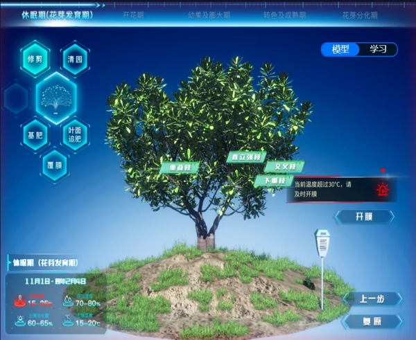 ?????? 運用數字孿生技術融合楊梅科學化生產,利用3D建模、全景拍攝技術和神經網絡、大數據等技術結合,搭建楊梅“孿生”一棵樹。通過孿生一棵樹將數字模型與經驗數據進行匹配、孿生模型與應用培訓進行匹配、物聯感知與技術指導進行匹配、業務服務與科學管理進行匹配,結合“e蘭茗果”掌上應用,實時指導梅農剪枝、除草、打藥、養護等農事行為。