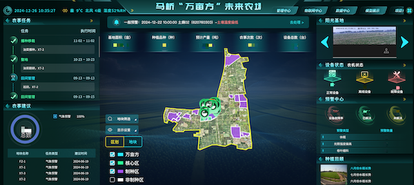 ? ? ? ?由浙江托普云農科技股份有限公司(股票簡稱:托普云農,股票代碼:301556)提供技術支撐的“萬畝方智慧大腦”是實現未來農場管理的核心。農事服務中心的大屏上,“智慧大腦”正實時監測著田間的作物長勢和病蟲害情況,并為農事生產提供著氣象預警、遙感監控查看、農事任務下發等服務,展現出滿滿的“科技感”。
