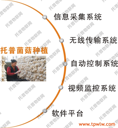 托普菌菇種植包括五大系統:1.信息采集系統—可采集空氣溫濕度、土壤溫濕度、光照強度、二氧化碳強度等參數;2.無線傳輸系統—可遠程無線傳輸數據;3.自動控制系統—包括噴灌、卷簾、風機、加熱、補光等,達到作物適合生長環境;4.視頻監控系統—查看作物實時生長情況、病蟲害防治和自動監控功能;5.軟件平臺---遠程數據實時查看參數和自動控制功能,各類報警功能等。