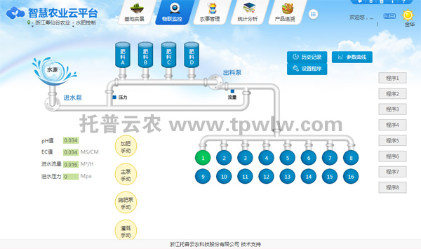 壽仙谷源口基地全景托普云農為壽仙谷源口基地建設的水肥一體化智能監(jiān)控系統(tǒng)主要涵蓋施肥機系統(tǒng)、過濾系統(tǒng)、前端灌水器系統(tǒng)、遠端控制灌溉系統(tǒng)(包括手機APP和電腦PC端)。
