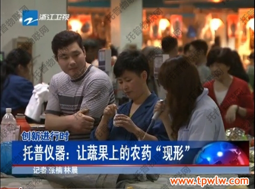 2013年5月22日晚,浙江新聞聯(lián)播報道了杭州市萬壽亭農(nóng)貿(mào)市場一位用農(nóng)藥殘留速測儀檢測自己所賣蔬菜的攤主以及農(nóng)藥殘留速測儀的研發(fā)及生產(chǎn)廠家——浙江托普儀器有限公司。