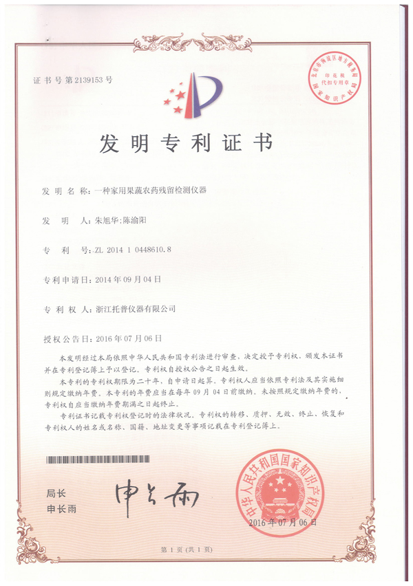 ?? ? ? 浙江托普云農科技股份有限公司(股票代碼:833692)申請的“一種家用果蔬農藥殘留檢測儀器”發明專利申請,已于2016年7月6日獲得中華人民共和國國家產權局頒發的發明專利證書。