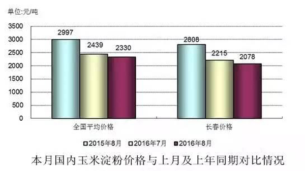 2016年7-8月份國內(nèi)淀粉價格先跌后漲,總體仍呈下跌趨勢。8月份全國淀粉平均價格為2330元/噸,環(huán)比下降108元/噸,降幅4.45%;同比下降667元/噸,降幅22.25%。其中,長春地區(qū)淀粉出廠價格為2078元/噸,環(huán)比下跌137元/噸,降幅6.18%;同比下降730元/噸,降幅25.99%。