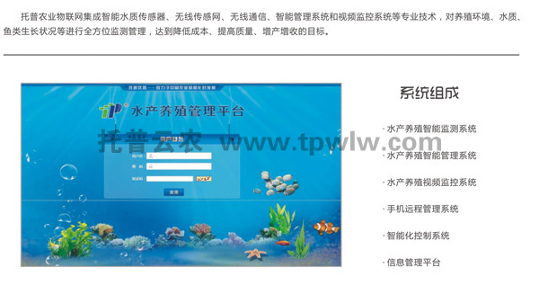 水產(chǎn)養(yǎng)殖監(jiān)控系統(tǒng)是一套物聯(lián)網(wǎng)為核心,貫穿整個(gè)養(yǎng)殖過程,科技化、智能化、便捷性、低成本、高收益的水產(chǎn)養(yǎng)殖系統(tǒng),它的應(yīng)用標(biāo)志著經(jīng)驗(yàn)養(yǎng)殖的方式正在逐漸成為歷史,科技養(yǎng)殖的時(shí)代開始到來。托普云農(nóng)水產(chǎn)養(yǎng)殖監(jiān)控系統(tǒng)利用各種水質(zhì)傳感器測驗(yàn)PH、溶解氧、溫度等重要的水質(zhì)數(shù)據(jù),并及時(shí)作出調(diào)整,使水質(zhì)達(dá)到最佳狀態(tài)。