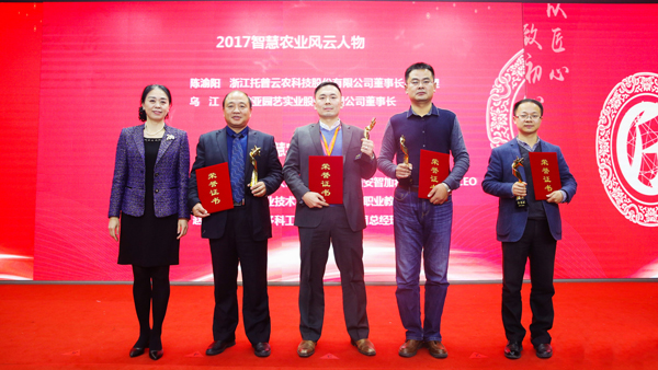 圖:托普云農(nóng)副總經(jīng)理朱旭華(右一)代陳渝陽董事長上臺領(lǐng)取2017智慧農(nóng)業(yè)風云人物