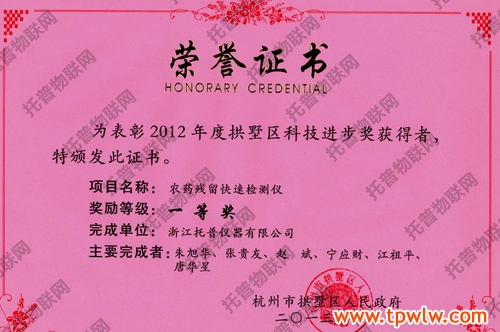 2012年度拱墅區(qū)科學(xué)技術(shù)進步獎通過企業(yè)申報,有關(guān)部門推薦,并經(jīng)專家評審,托普儀器農(nóng)藥殘留快速檢測儀項目最終獲得2012年度拱墅區(qū)科技進步獎一等獎。