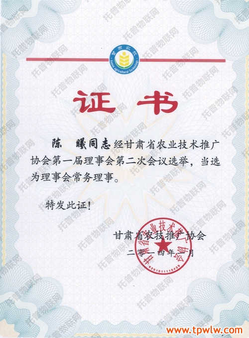 圖為:托普儀器陳曦經(jīng)理任甘肅省農業(yè)技術推廣協(xié)會常務理事證書