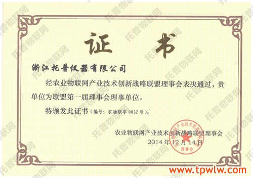 2014年6月7日,北京智慧農(nóng)業(yè)物聯(lián)網(wǎng)產(chǎn)業(yè)技術(shù)創(chuàng)新戰(zhàn)略聯(lián)盟籌備成立大會暨第一次會員代表大會在北京召開。會議宣讀了決定準予《北京智慧農(nóng)業(yè)物聯(lián)網(wǎng)產(chǎn)業(yè)技術(shù)創(chuàng)新戰(zhàn)略聯(lián)盟》籌備的行政批復(fù),并經(jīng)首屆理事會表決,選舉產(chǎn)生了第一屆聯(lián)盟組織機構(gòu),其中包括首屆聯(lián)盟主席單位,五家聯(lián)盟副主席單位,“浙江托普儀器有限公司”等八家單位當選為聯(lián)盟第一屆理事會理事單位。