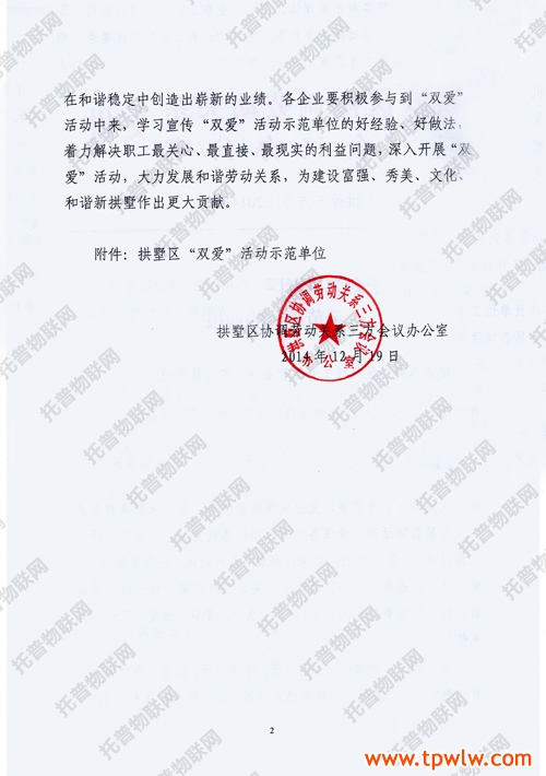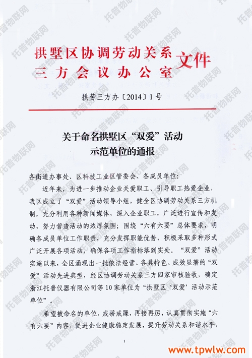 近日,《關于命名拱墅區“雙愛”活動示范單位的通報》文件頒布,托普儀器被評選為拱墅區“雙愛”活動示范單位。