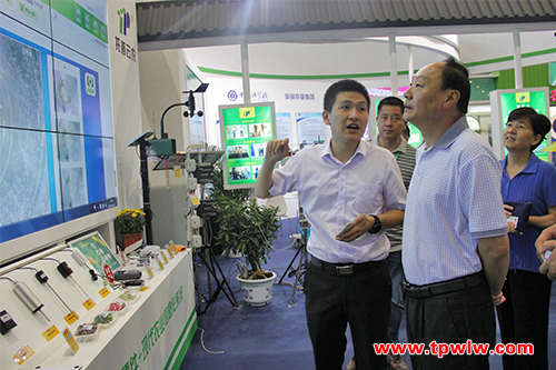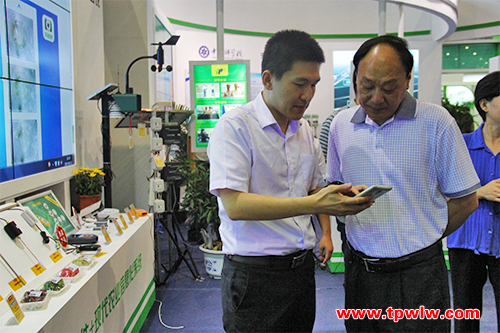 會議期間,安徽省政協副主席兼省政府秘書長邵國荷先生、安徽農委趙穎南總農藝師一行蒞臨8號館電子商務及物聯網展區觀摩托普云農自主研發生產的農業物聯網綜合服務平臺。重點詢問了托普云農所展出的以色列作物本體傳感器和植物營養測定儀等系統設備的相關情況。陳曦經理為其一一介紹。