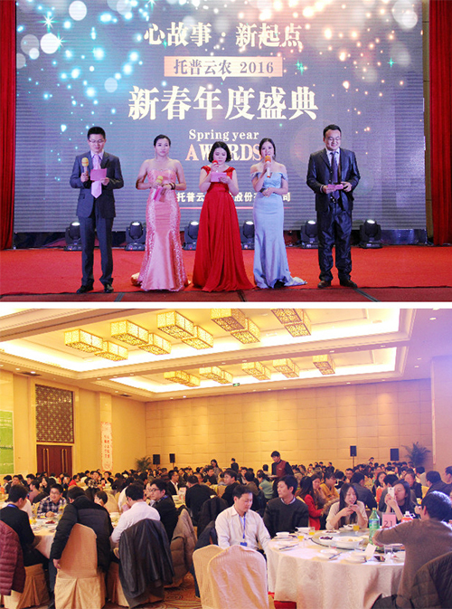 羊隨新風辭舊歲,金猴獻瑞迎新春。2016年1月30日,“新起點 新起航——托普云農(nóng)2015年度總結(jié)表彰大會暨2016迎新春聯(lián)歡會”在杭州海外海·納川大酒店隆重舉行。300余名托普家人共聚一堂,回顧這一年所取得的成績,規(guī)劃2016年新的奮斗目標,共同迎接歡樂幸福的農(nóng)歷新年。