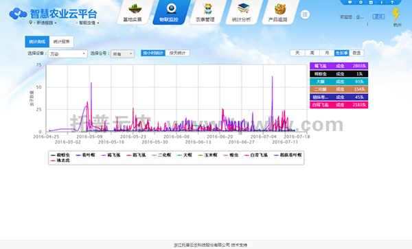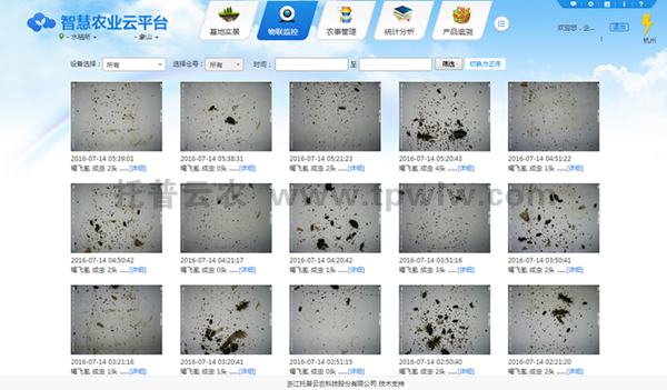 系統通過搭建在田間的智能蟲情監測設備,可以無公害誘捕殺蟲,綠色環保,同時利用GPRS/3G移動無線網路,定時采集現場圖像,自動上傳到遠端的物聯網監控服務平臺,工作人員可隨時遠程了解田間蟲情情況與變化,制定防治措施。通過系統設置或遠程設置后自動拍照將現場拍攝的圖片無線發送至監測平臺,平臺自動記錄每天采集數據,形成蟲害數據庫,可以各種圖表、列表形式展現給農業專家進行遠程診斷。