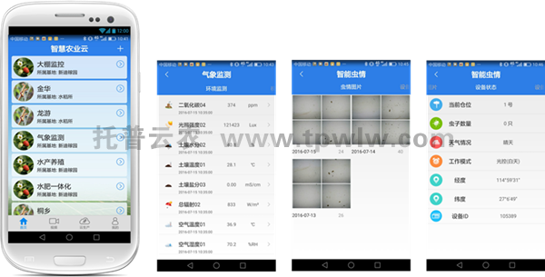 - 農林(農業)“四情”監測系統發表日期:2021-02-25 來源:托普云農 瀏覽次數:204482次托普農業物聯網農林“四情監測預警系統”(墑情、苗情、蟲情、災情)也叫農業四情監測系統,簡稱農林“四情”監測系統,它以先進的無線傳感器、物聯網、云平臺、大數據以及互聯網等信息技術為基礎,由墑情傳感器、苗情災情攝像機、蟲情測報燈、網絡數字攝像機、作物生理生態監測儀,以及預警預報系統、專家系統、信息管理平臺組成。各級用戶通過Web、PC與移動客戶端可以訪問數據與系統管理功能,對每個監測點的病蟲狀況、作物生長情況、災害情況、空氣溫度、空氣濕度、露點、土壤溫度、光照強度等各種作物生長過程中重要的參數進行實時監測、管理。系統聯合作物管理知識、作物圖庫、災害指標等模塊,對作物實時遠程監測與診斷,提供智能化、自動化管理決策,是農業技術人員管理農業生產的“千里眼”和“聽診器”。